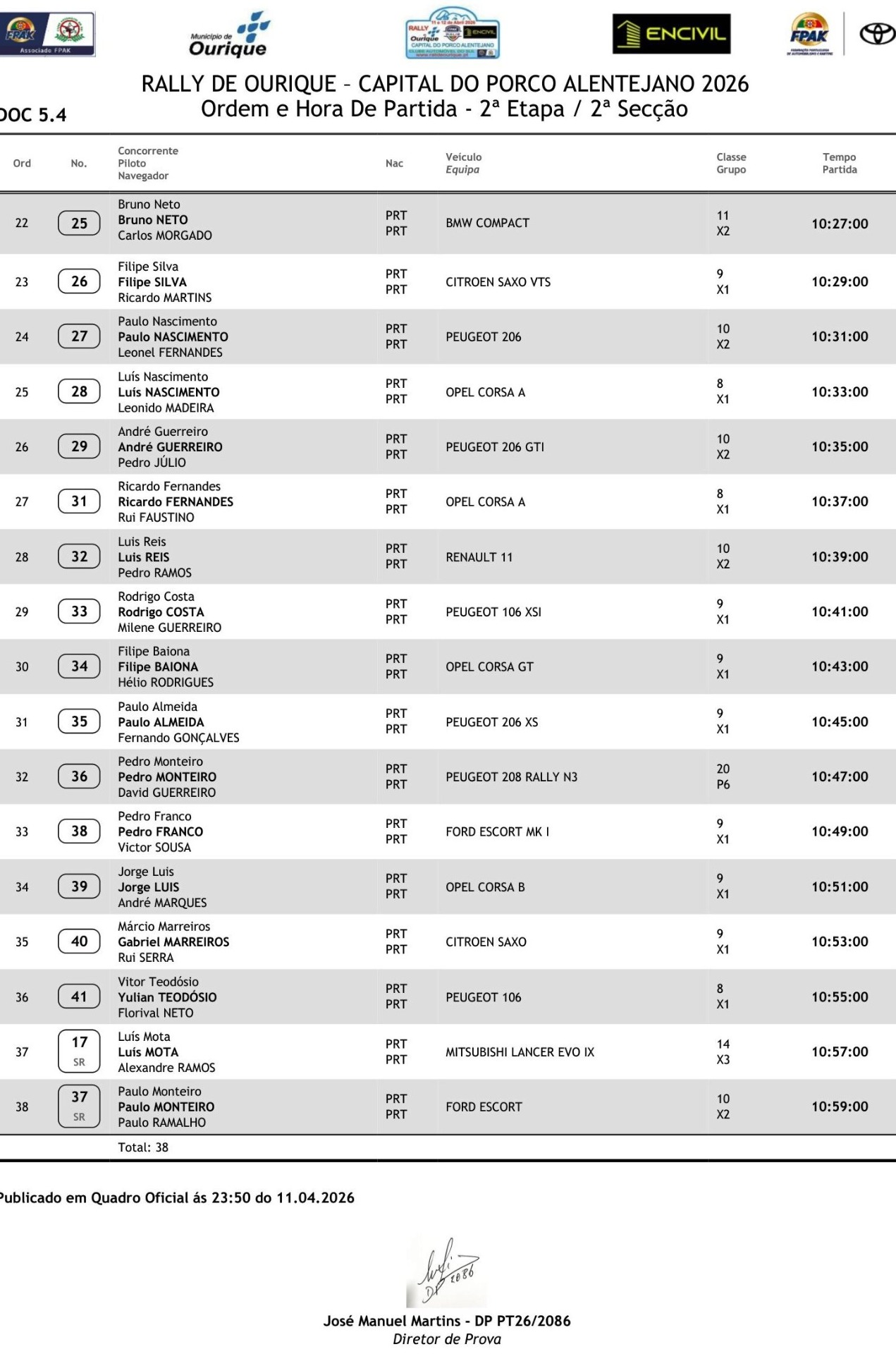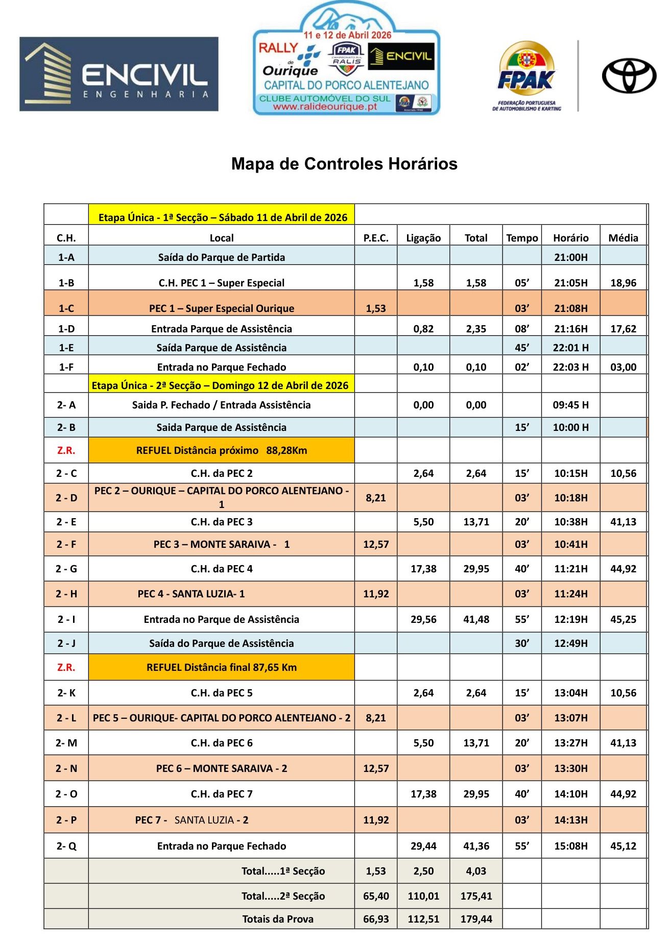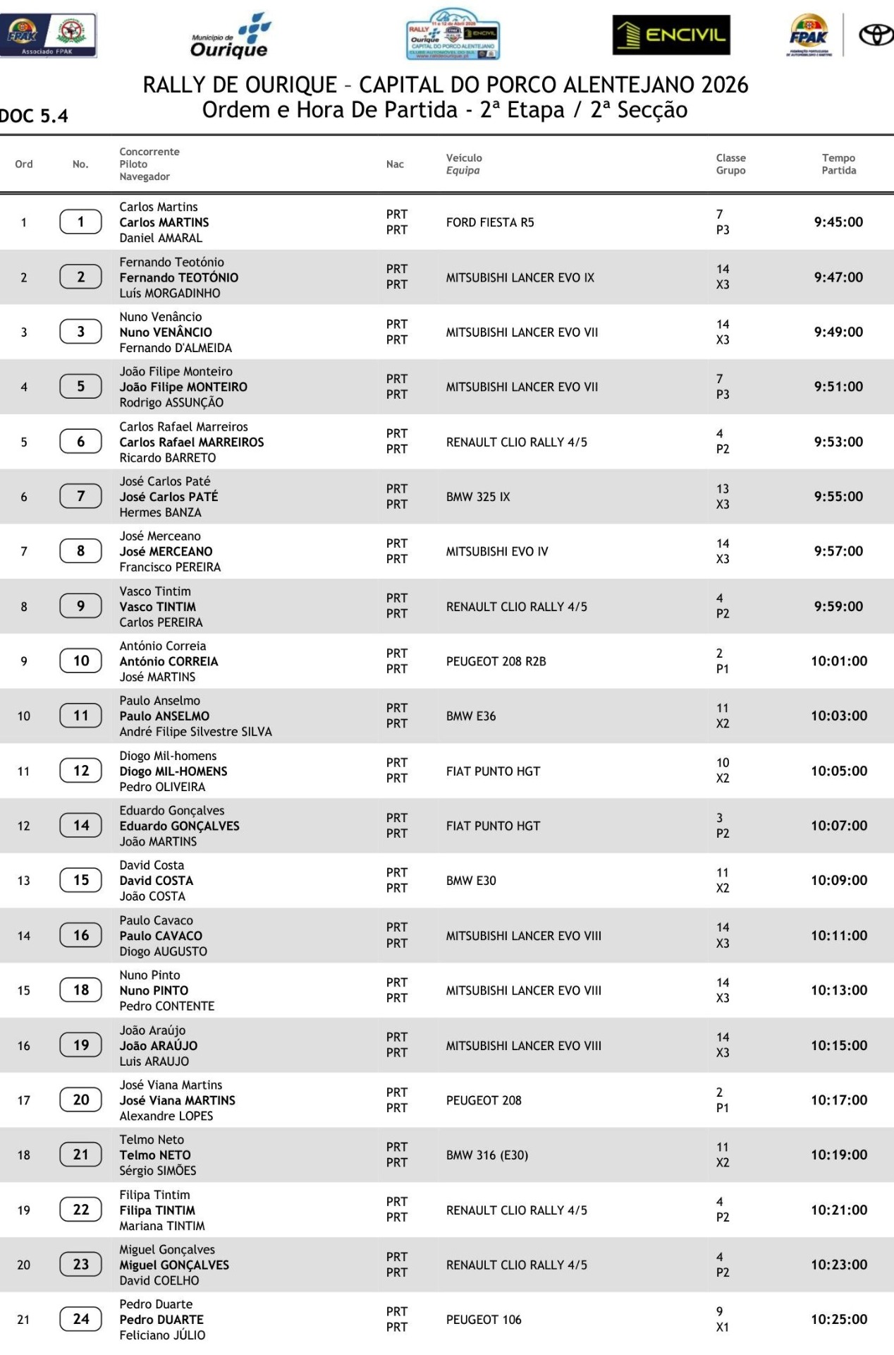 Ordem e Hora de Partida 2.ª Etapa + Lista de Inscritos + Roadbook Digital + Informações Importantes + Aditamento CCD 1 + Comunicação CCD1 + Comunicação CCD2 + Aditamento N.º 1 + Regulamento Particular + Mapa Controlos, Itinerários e Horários