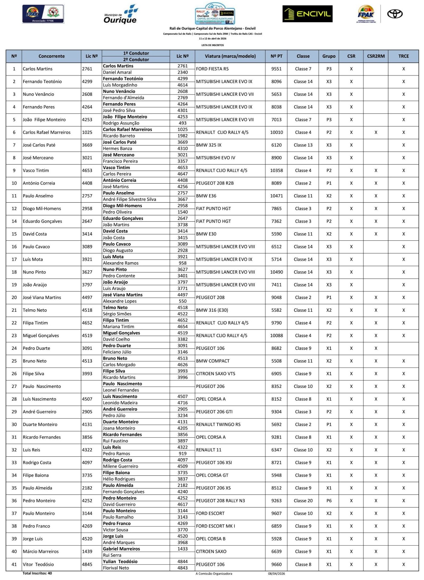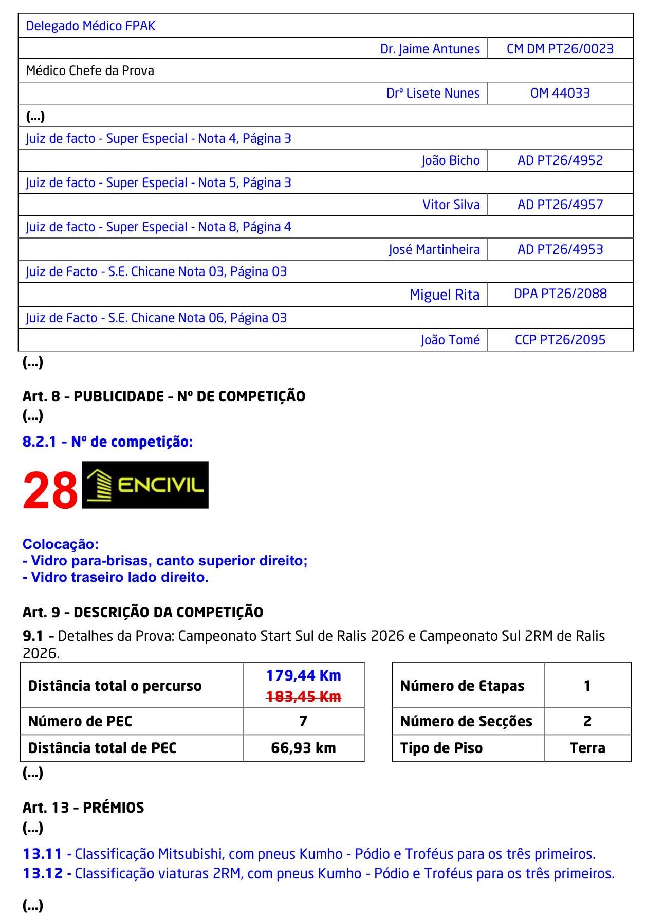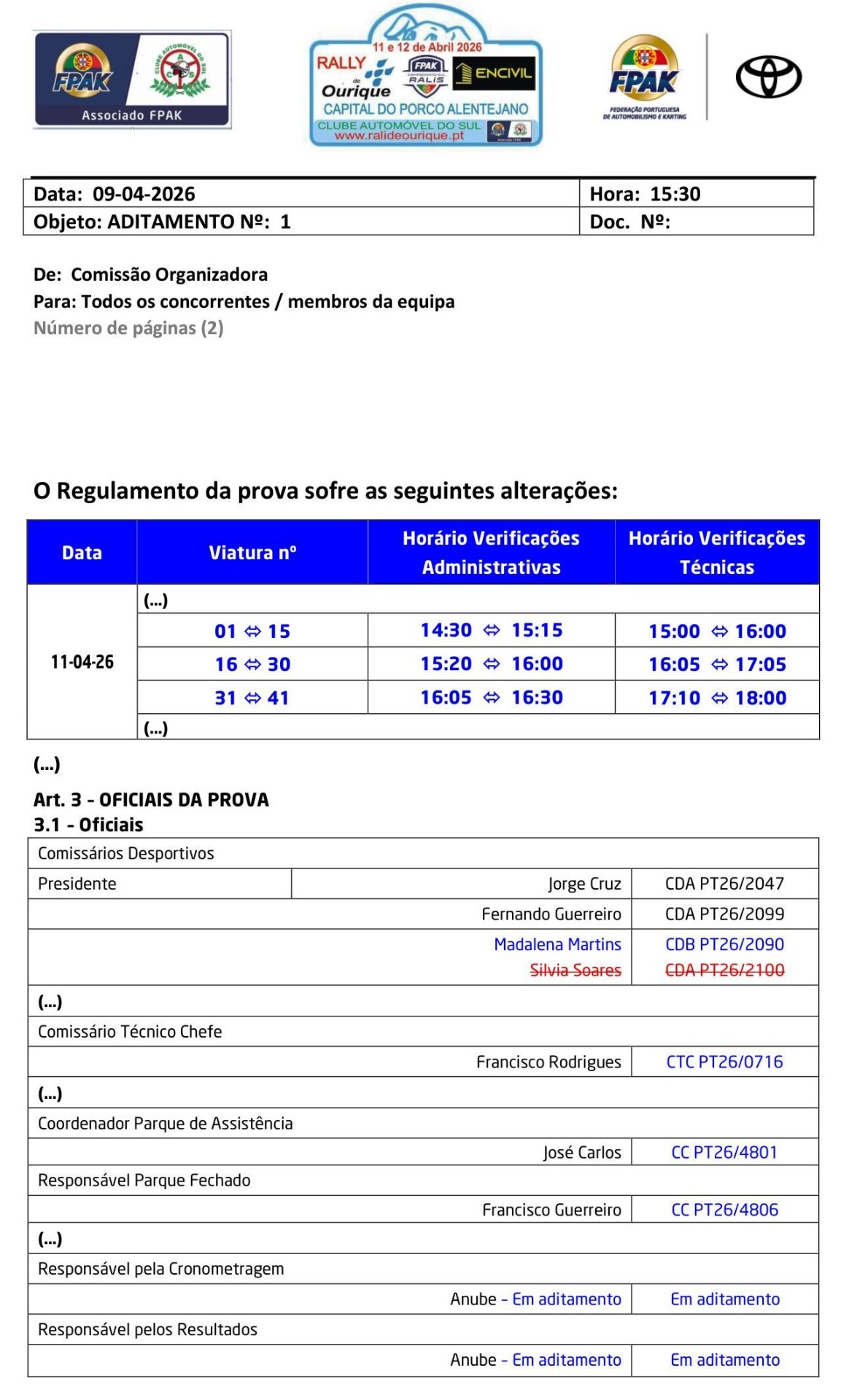 Ordem e Hora de Partida 2.ª Etapa + Lista de Inscritos + Roadbook Digital + Informações Importantes + Aditamento CCD 1 + Comunicação CCD1 + Comunicação CCD2 + Aditamento N.º 1 + Regulamento Particular + Mapa Controlos, Itinerários e Horários
