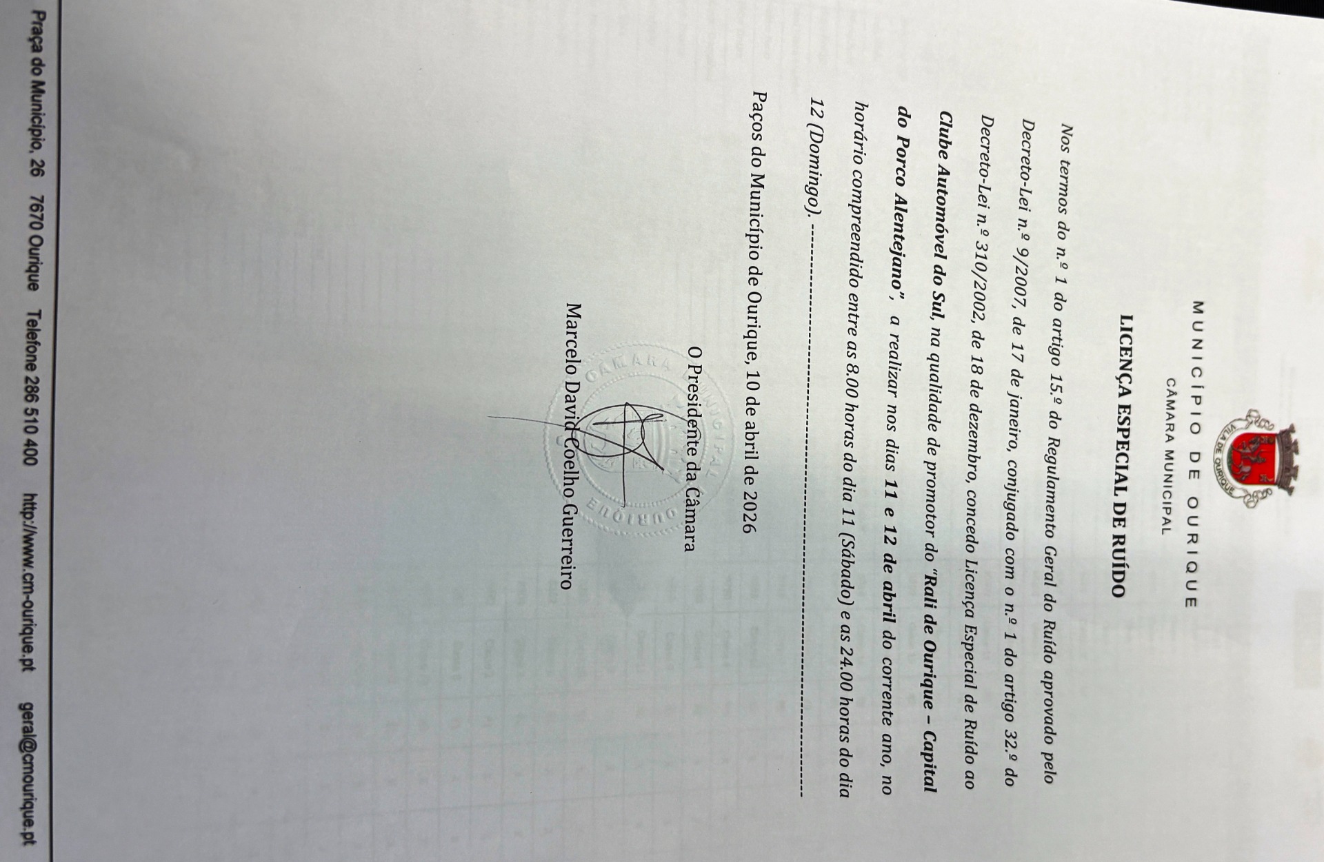 Declaração FPAK + Declaração Ageas Seguros + Licença Especial de Ruído + Alvará de Licença Câmara Municipal de Ourique