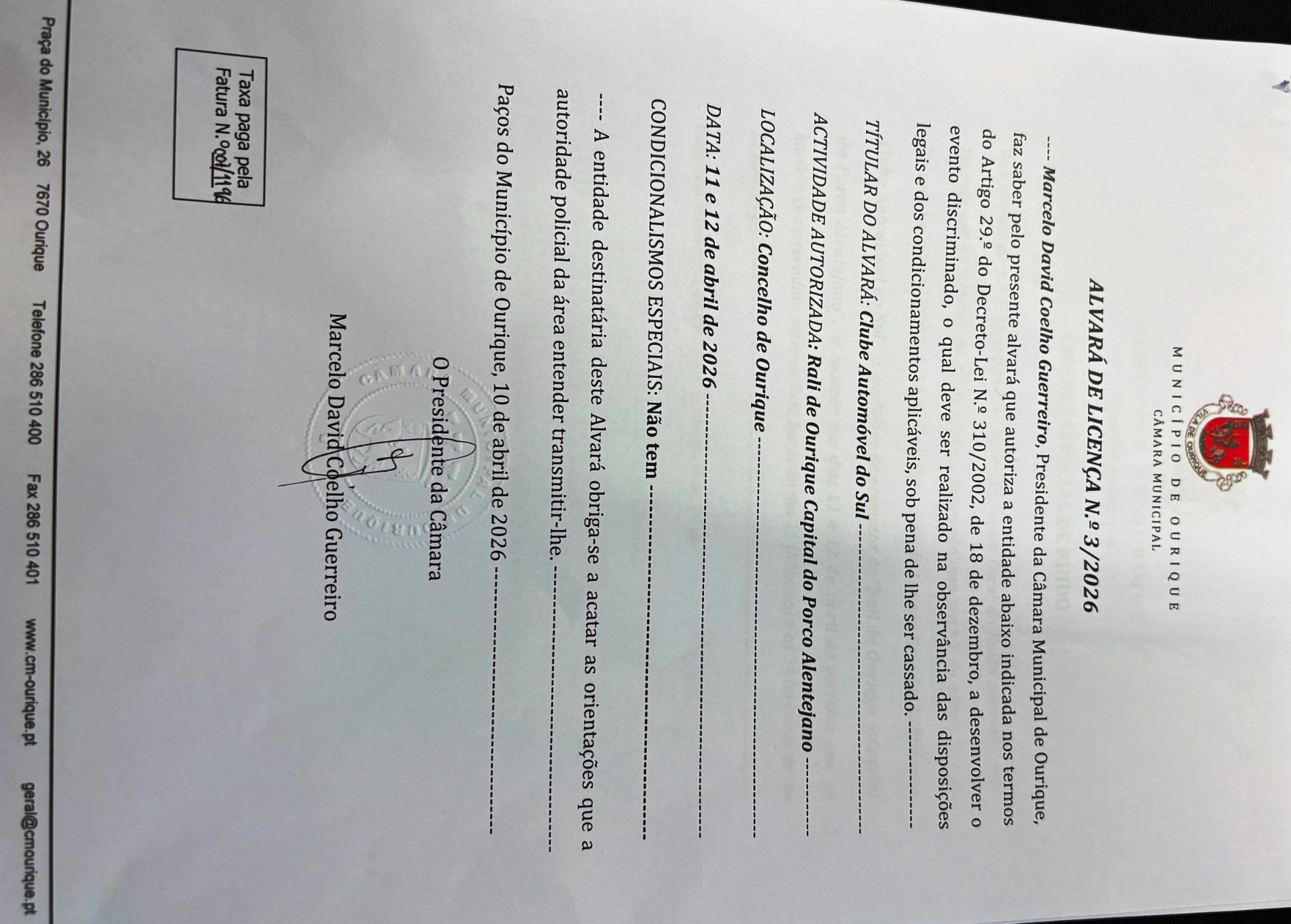 Alvará de Licença Câmara Municipal de Ourique